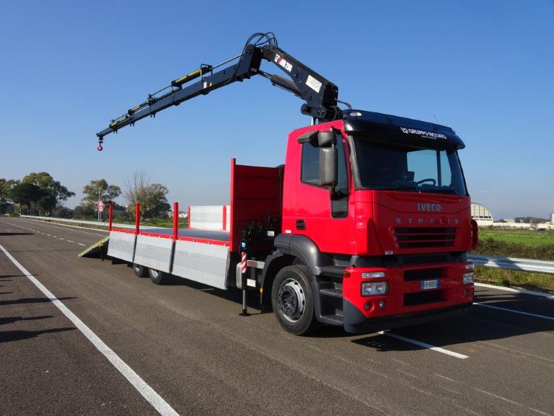 | Iveco Stralis 260S35 passo 5100 + 1395 con cassone idoneo al carico di macchine operatrici e attrezzature con sponda speciale dhollandia posteriore, Gru HIAB modello 200-5 e verricello |